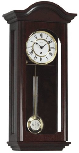 This cherry finish regulator is made with select hardwoods and veneers and features a bonnet crown, Roman numerals dial with black spade hands and a R&A bob with grid pendulum. Mechanical brass 8-day key wound movement plays 4/4 Westminster chimes.